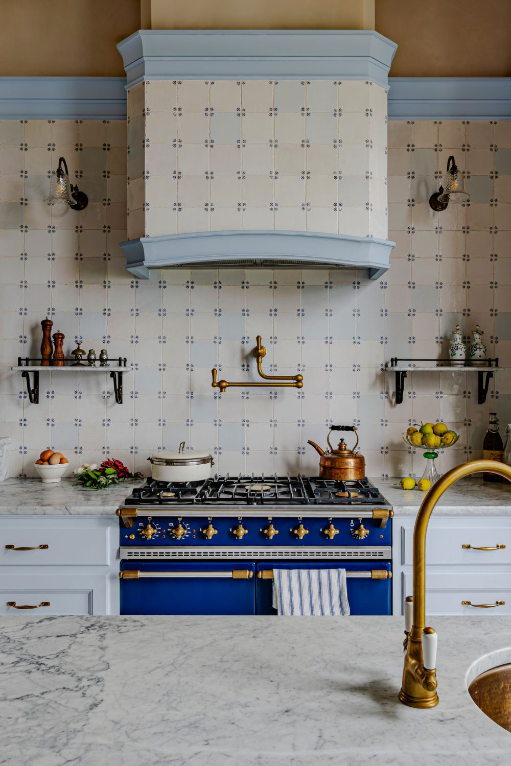 The Delft corner tiles used throughout the kitchen were handcrafted individually, with each piece made, glazed, and painted by hand using traditional techniques. When taking a closer look, subtle variations in colour, brushwork, and glaze reveal the unmistakable marks of the maker, giving the surface depth and softness that cannot be replicated by machine-made alternatives. These small differences are not imperfections, but details that speak to time, care and process.