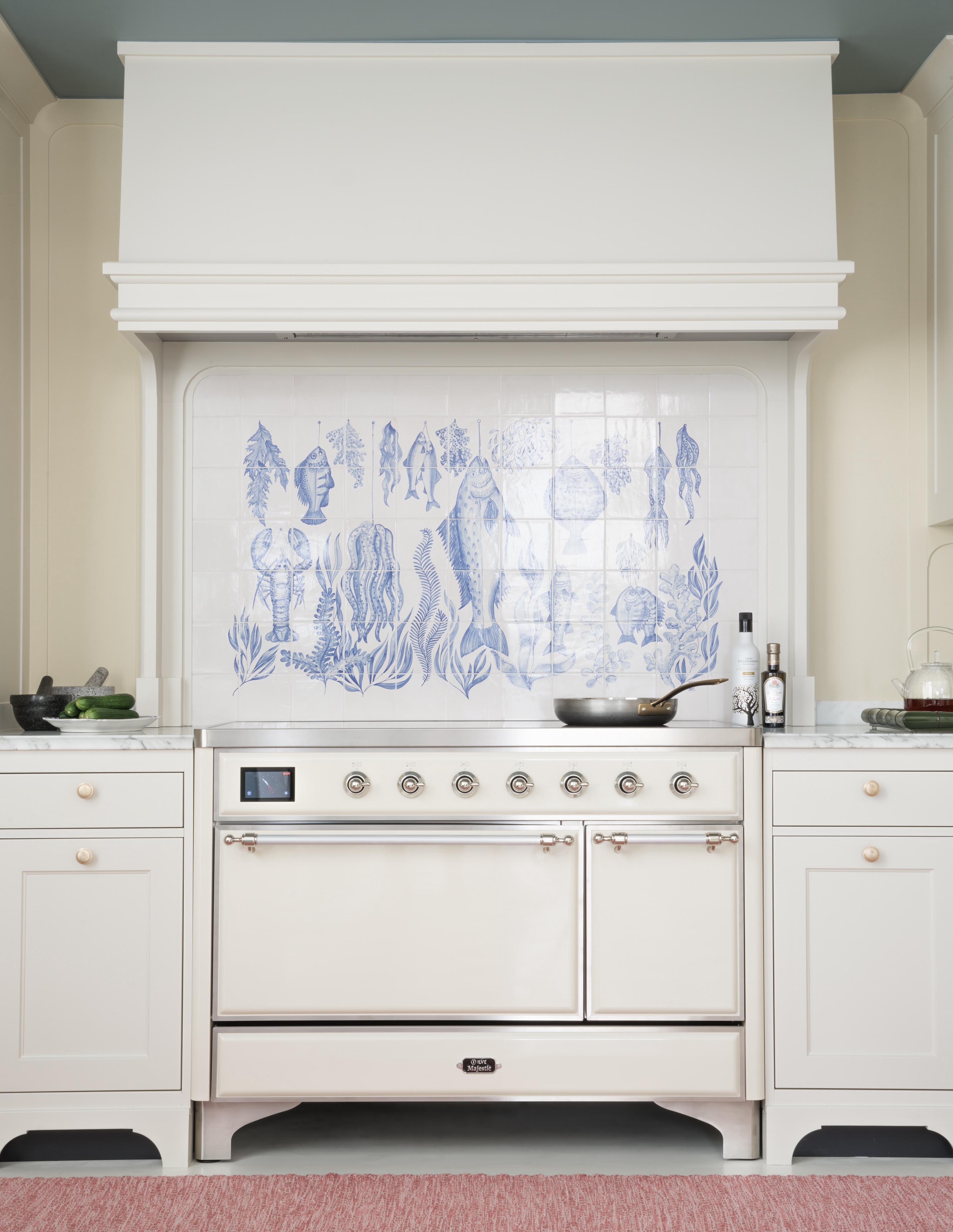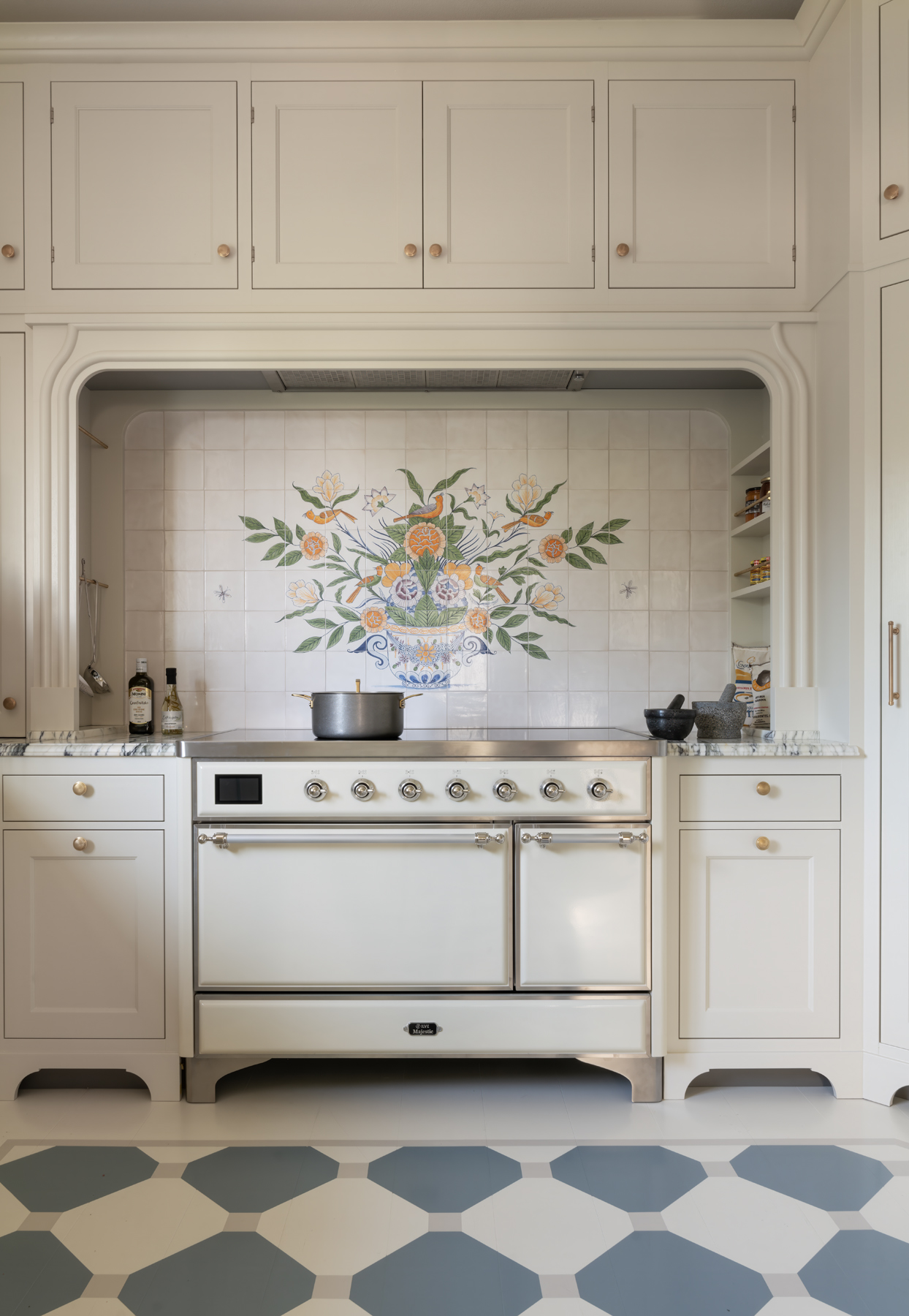 A collective of all of our ‘Papal’ tiles designs – a mixture of patterns, birds and animals gives this kitchen backsplash a real sense of interest, and is a stunning backdrop when cooking ones favourite family meals.